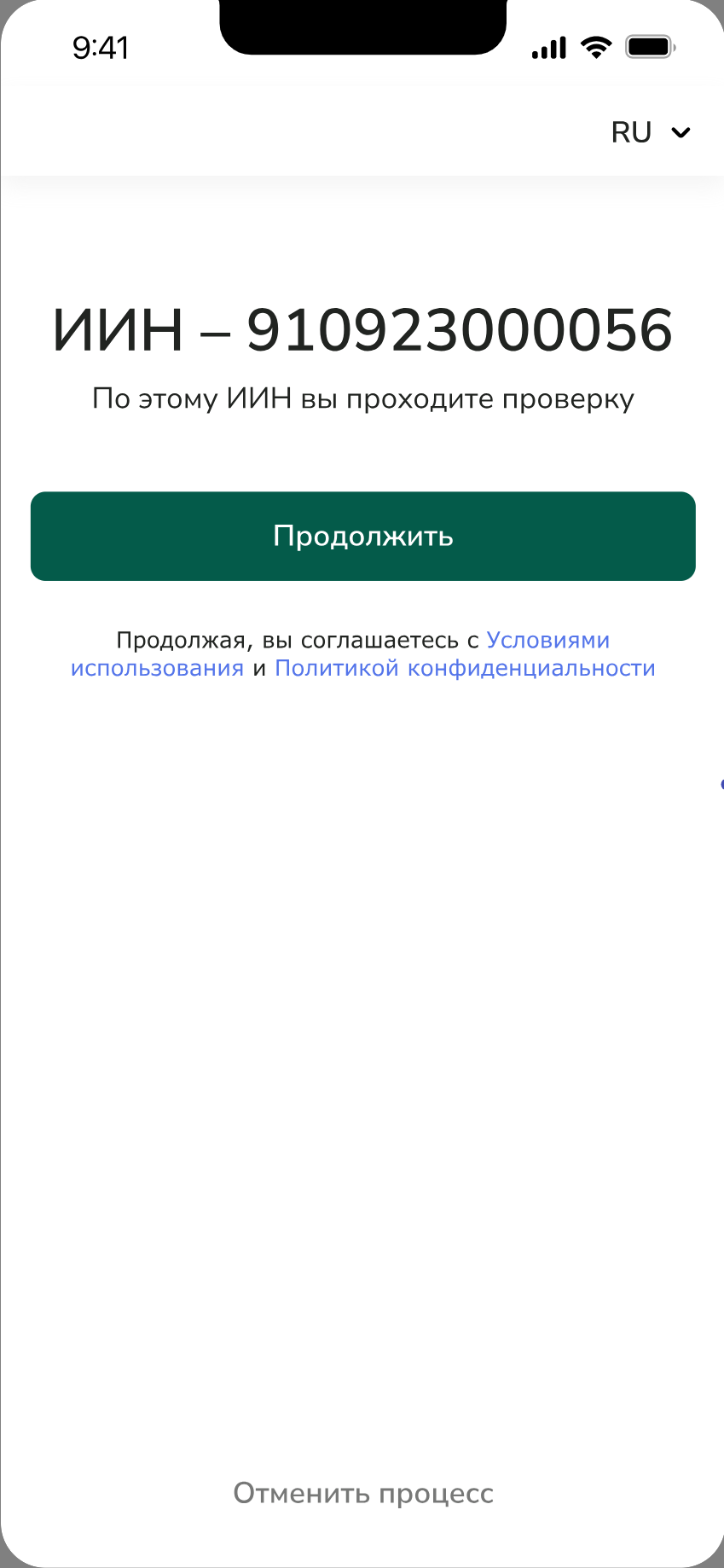 2.1. Пользователю отображается для подтверждения ИИН, по которому проводится верификация личности.